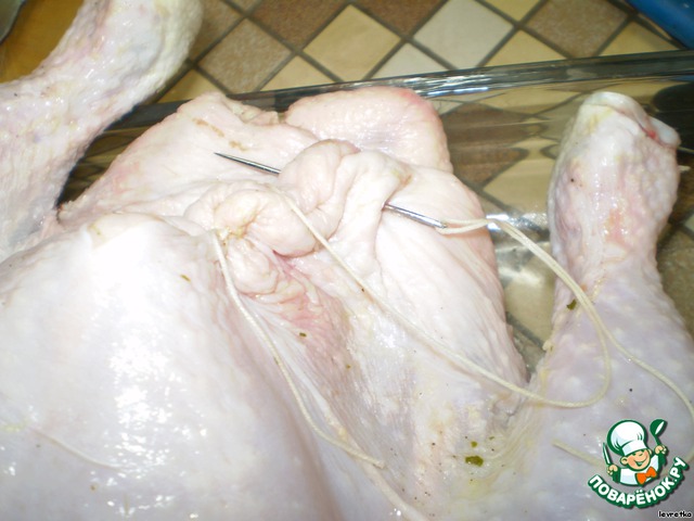 Далее зашиваем отверстие, через которое начиняли курицу. А отверстие возле шеи плотно затыкаем бумагой для запекания.