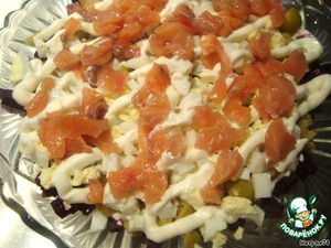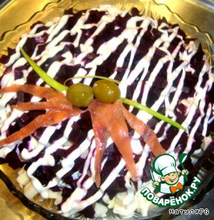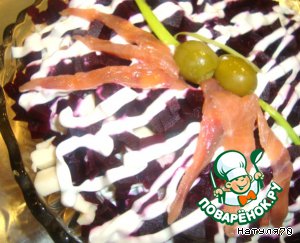 Последний слой - свекла + майонез. Поставьте салатик в холодильник на 30 минут. Перед подачей на стол украсьте рыбой.