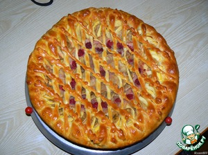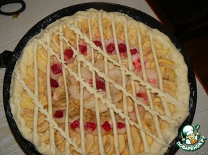 затем берем оставшееся тесто и делаем из него жгутики и украшаем этими жгутиками наш пирог крест накрест, первый слой жгутиков я делала кругленькими, а второй как елочка раскатывала длинный круглый жгутик намного прижимала к столу а затем ножом делала надрезы. Можете сделать и по своему. Между жгутиков в некоторых местах я положила малинку.