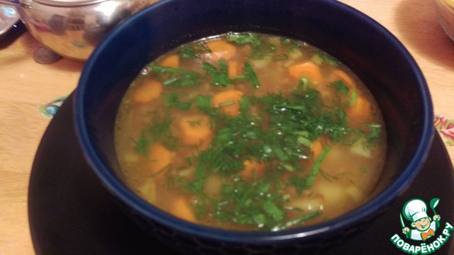 Итак, берем все те же два литра воды или бульона. Если в семье 10 человек, то, понятно, надо больше. Но в данном случае речь идет о среднестатистической семье в количестве 2 -3 человек, и хватит этого супа на два дня. Припускаем для золотистого цвета морковь с луком на сковородке и вместе с картофелем, нарезанным кубиками, отправляем в кипящую воду. Следом бросаем гречку, а в конце варки соль, приправу и зелень.