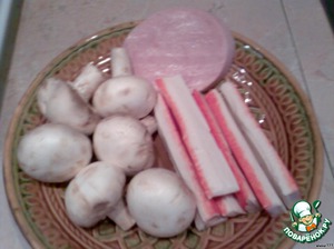Крабовые палочки лучше взять покороче, но в пачке их побольше. У меня была упаковочка 200г, их в ней 6 штучек, но уж очень длинные. Фаршированные и в кляре палочки получились огромные, одной можно накушаться. Хотя размерчик тоже на любителя. Берём 6 штучек шампиньонов, крабовые палочки и ветчину. У меня была ветчина из куриного мяса.