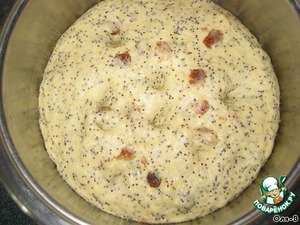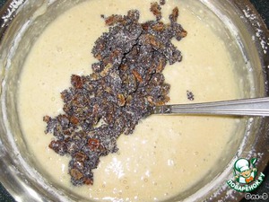 В опару всыпать стакан просеянной муки, перемешать, влить смесь с растительным маслом, добавить мак и изюм, еще раз перемешать. -