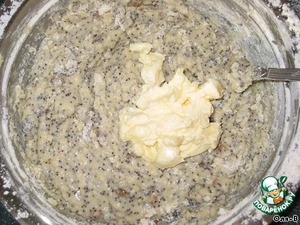 Затем всыпать еще пол стакана просеянной муки, перемешать и добавить мягкое сливочное масло, хорошо вымешать, чтобы масло распределилось равномерно.