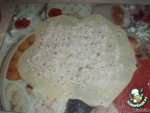 Накройте разделенное тесто полотенцем, чтобы оно не сохло. Возьмите один кусочек и раскатайте его как можно тоньше в круг. Я раскатывала очень тонко. Раскатанное тесто смажьте очень размягченным, сливочным маслом. Посыпьте на тесто начинку. Я сыплю много.