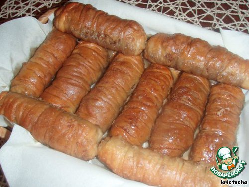 Таким же образом раскатайте, просыпьте начинкой и сверните все оставшееся тесто. Сделанные кусочки пахлавы выкладываем на застеленный пергаментом противень и накрываем сделанные кусочки полотенцем, чтоб не сохли. -
