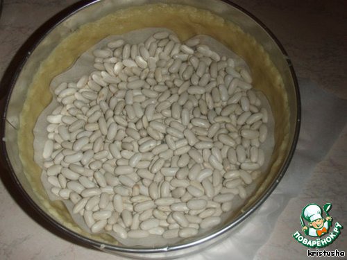 Поставить в духовку и выпекать ~ 25 мин. Если под бумагой с фасолью тесто не пропеклось (как у меня), то вернуть в духовку уже без фасоли минут на 10-15.