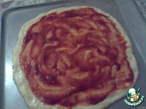 Смазать тесто кетчупом, немного не доходя до краёв.