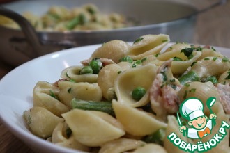 Туда бросаем рожки (крупную лапшу, ракушки, спиральки) - любые макаронные изделия, только не мелкие. Естественно, воды должно быть такое количество, чтобы макароны сварились.