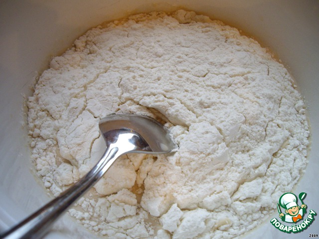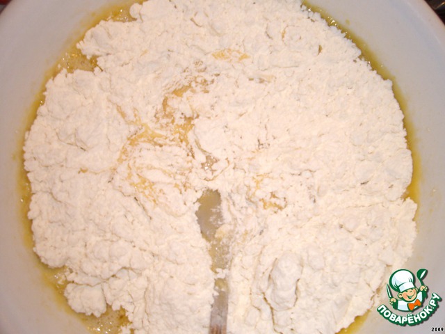 7. Добавить 300-350 г муки, хорошо перемешать. -