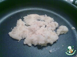 Пока кальмары остывают, поджариваем на сковороде лук со сливочным маслом. Я брала 1 чайную ложку, так как целью было приготовить низкокалорийное блюдо, если этой цели нет, можно взять любое достаточное для вас количество.