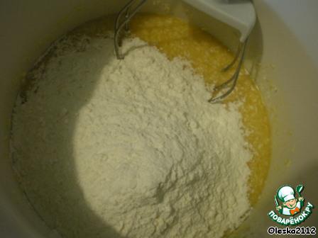 А теперь всыпаем муку, смешанную с разрыхлителем. Всё тщательно перемешать.