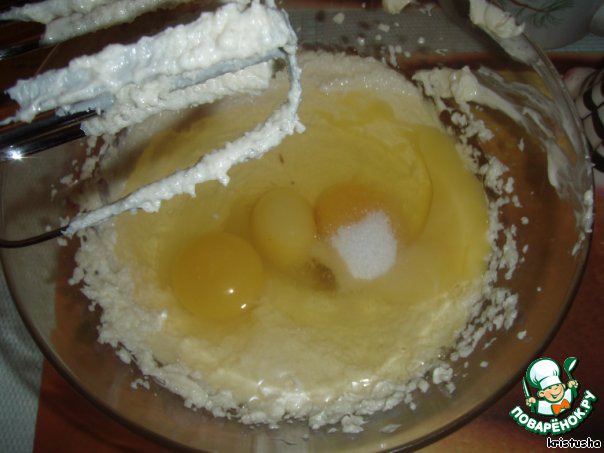 Тесто: для начала масло взбиваем с сахаром, добавляем по одному яйца. -