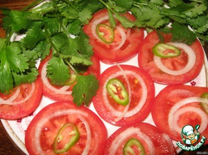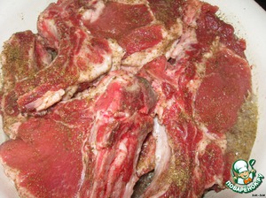 Каждый кусок натираем солью и специями, заливаем минералкой, придавливаем грузом и оставляем мариноваться часа на 4 (желательно на всю ночь)