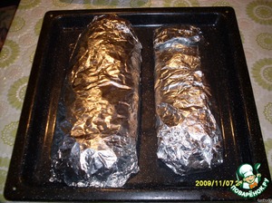 Завернуть в фольгу. Уложить на противень и поставить в духовку.