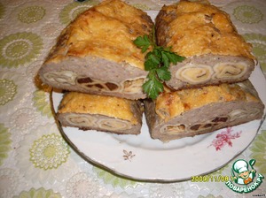 Чернослив распарить и порезать соломкой, сыр натереть на терке, яйца порезать кубиками. В половину блинов положить сыр с яйцами, свернуть трубочкой. В другую - чернослив. Не сфоткала процесс... простите... Фарш выложить на фольгу и разровнять по длине блинов. Сверху, чередуя, выложить блинчики. Закрыть все фаршем, придавая форму батона.