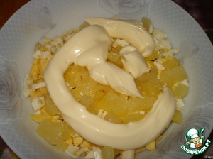 Яйцо порезать кубиками, ананас порезать кусочками, все это добавить к нарезанным ранее ингредиентам и заправить майонезом. Все тщательно перемешать.