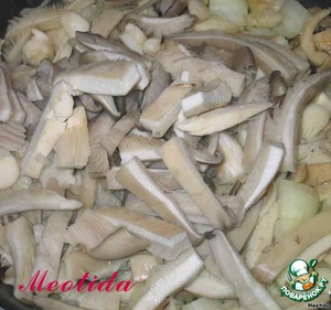 грибочки и лук нарезаем полосочками и обжариваем на горячей сковородке в небольшом количестве растительного масла до золотистого цвета
