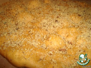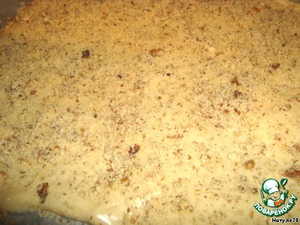 Противень застелите бумагой для выпечки. Готовое тесто распределите ровным слоем на бумаге (1-1,5 см). Тесто очень липкое. Пальчики нужно смачивать водой. Сверху посыпьте измельченным грецким орехом. Отправляем в духовку на 15 минут.