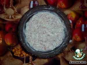 • Добавить к куриному филе яйца, майонез, чеснок, специи и муку (крахмал). Дать постоять примерно 30-40 минут.