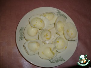 • Остудить. Разрезать яйца пополам. Вынуть из яиц желток.