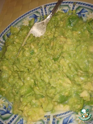 Спелый авокадо разрезать пополам, удалить косточку, мякоть размять вилкой. Можно грубо размять. До состояния пюре не надо. Быстро полить соком лимона, вымешать.