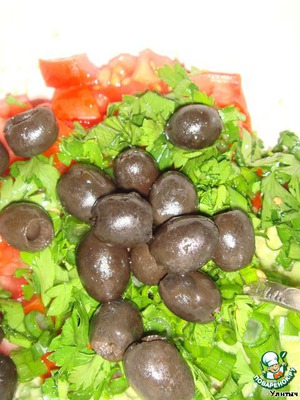 Дальше все просто и быстро. Помидоры режем кубиками, шинкуем петрушку и лук, добавляем маслины, оливковое масло, солим.