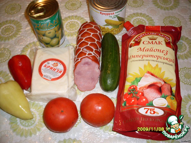 Ветчину порезать соломкой. Яйца, брынзу, перец, помидоры, огурец - кубиками. Оливки - кружочками. Добавить кукурузу. Заправить майонезом и подать к столу.