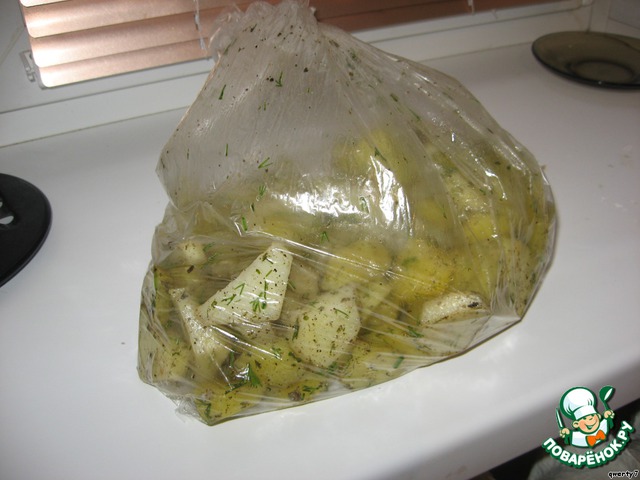 • Припущенный в молоке картофель высыпаем в пакет, туда же добавляем зелень, перец, соль и подсолнечное масло. Хорошо встряхиваем пакет, чтобы весь картофель покрылся подсолнечным маслом.