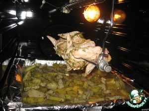 • В духовку ставим картофель, в самый низ, а сверху на решетке кладем курицу(весь сок с курицы будет капать на картофель). Или же просто ставим вертел с курицей.