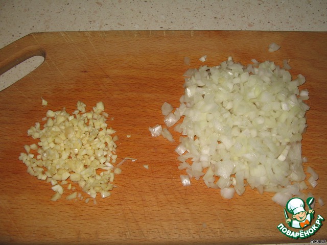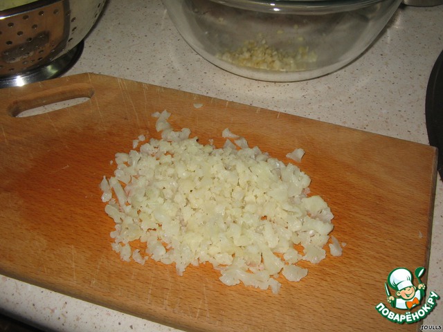 Пока вода закипает и капуста варится, измельчаем луковицу и чеснок. Думаю, можно воспользоваться чесночницей, но я не люблю данный агрегат и использую редко, т. к. после его применения чеснок начинает проявлять свои не самые хорошие качества - появляется горечь, и вместо тонкого аромата блюдо приобретает резкий запах чеснока. Но это мое субъективное мнение.