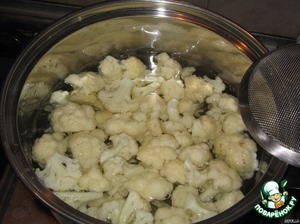 Цветную капусту моем, разбираем на соцветия и отвариваем 5 минут в подсоленной воде.