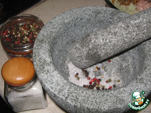 Очень люблю смесь перцев - такой пряный аромат и вкус!!! Я смолола крупную морскую соль и перцы в ступке, но можно использовать и поваренную соль и черный перец, НО он должен быть свежесмолотым. Если у Вас нет ступки или мельнички, просто заверните перчинки-горошки в салфетку и хорошенько постучите по ним скалкой или каким-нибудь подручным небьющимся предметом. Кстати, отлично снимает стресс! :-)