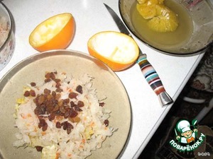 Нарезать мякоть маленькими кубиками, перемешать с изюмом, орехами. капустой и заправить майонезом. Наполнить половинки апельсина данной смесью.