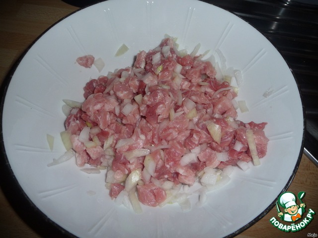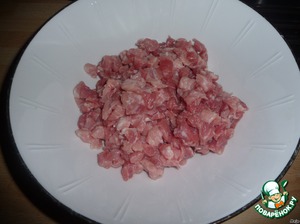 Берем любое мясо ( у меня свинина), рубим на мелкие кусочки.