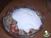 Заливаем салат заправкой! Перемешиваем. |