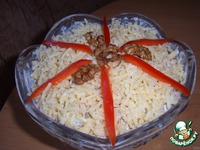 Готовим украшение! Тертый сыр и грецкие орехи выбрала не случайно, они тоже добавляют салату пикантность. Вот такой салат получился. ВСЕМ ПРИЯТНОГО АППЕТИТА!!! |