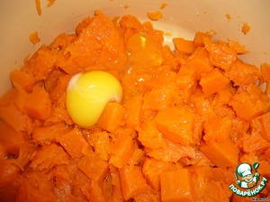 Тыкву нарезать на мелкие кубики, добавить яйцо, соль, все перемешать.
