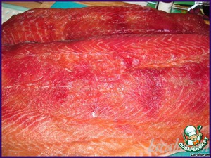 Кладём смесь толстым слоем на каждое филе (у меня ушло по 4 ст. л. соли и сахара на каждую половинку). Тут вроде и всё - но я делала ведь красную-красную рыбу!
