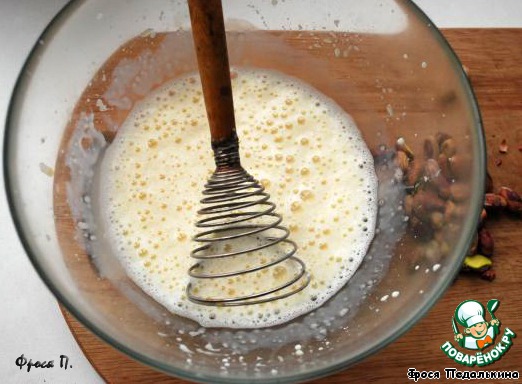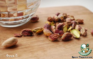 Фисташки очистить, мелко порубить. Растереть с 1 ст. л. сливочного масла.