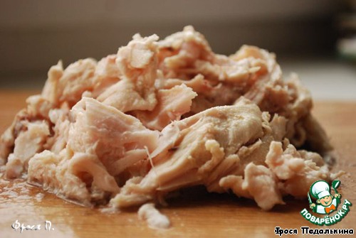 Куриное мясо вынуть из бульона, освободить от костей, треть отложить.