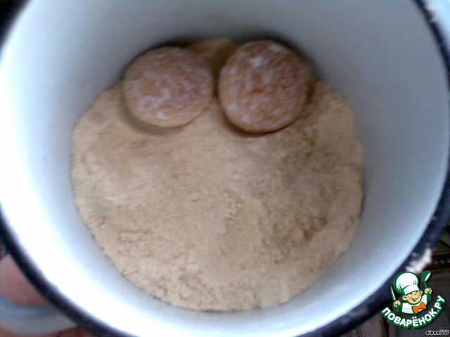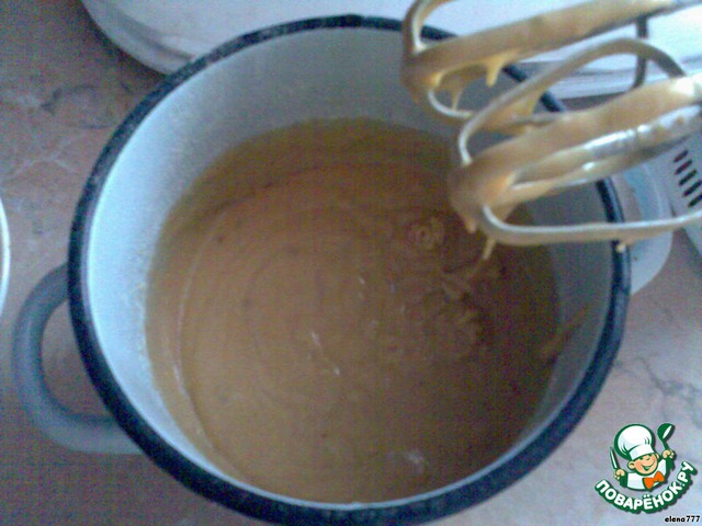 • Замесить тесто: яйца взбить со сгущёнкой, добавить растопленный маргарин, соду, молотые пряники и муку, снова взбить.