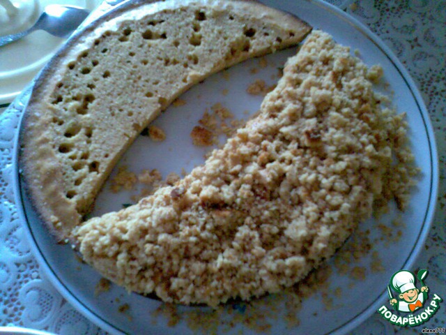 • Для прослойки взбить 5 ст.л. сметаны с варёной сгущёнкой. Смазать одну половинку, сверху посыпать крошкой.