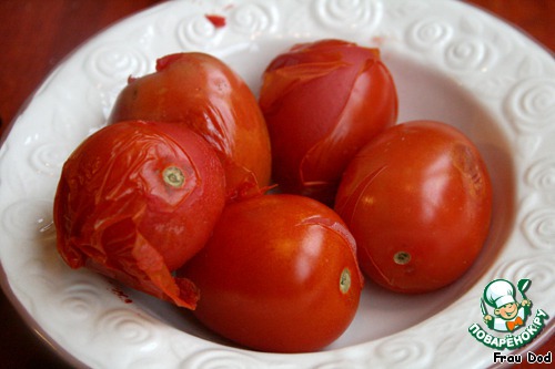 Поместить помидоры целиком в кожуре в предварительно нагретую до 200 градусов духовку. Выпекать 15 минут, переворачивая, пока с них не начнет слезать кожица. Вынуть из духовки, немного остудить и очистить.