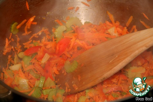 В кастрюле разогреть оливковое масло. Положить морковь, сельдерей, лук и перец, немного потомить. Добавить орегано и базилик, обжарить все вместе, помешивая.