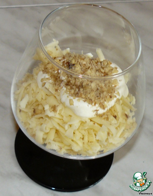 • Сыр натереть на крупной терке и выложить в креманки. Полить сметаной, посыпать измельченными орехами.