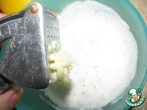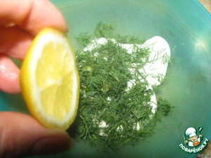 Для соуса, смешиваем оставшуюся сметану с укропом, добавляем лимонный сок.
