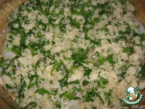 Через 40 минут, на рыбу выложить смесь крошек и зелени. Запекать в, разогретой до 190 градусов, духовке до готовности (30-35 минут).