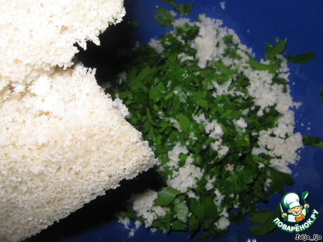 • Тем временем, мелко нарезать зелень. Хлеб покрошить руками, смешать с зеленью.