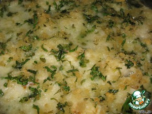 • Через 40 минут, на рыбу выложить смесь крошек и зелени. Запекать в, разогретой до 190 градусов, духовке до готовности (30-35 минут).