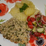 А я рыбу сначала полила соком лимона,потом маслом(подсолнечным сыродавленным),потом поперчила,дала постоять минут 20 и выложила сверху смесь из крошек,брынзы,тертой четвертинки корня сельдерея(ну совсем в доме зелени нет)чеснока лепестками и двух грецких орешков.Из-за брынзы не солила.